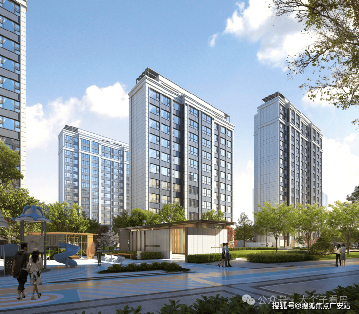 通过园林中曲径通幽的设计手法,布置景墙设计,引人入胜。社区内打造大树聚场、儿童乐园、阳光草坪、健身跑道等多个功能空间,依托架空层构建出更多的互动空间,扩展社区内的活力活动场域,为居者营造更多幸福生活的场景。