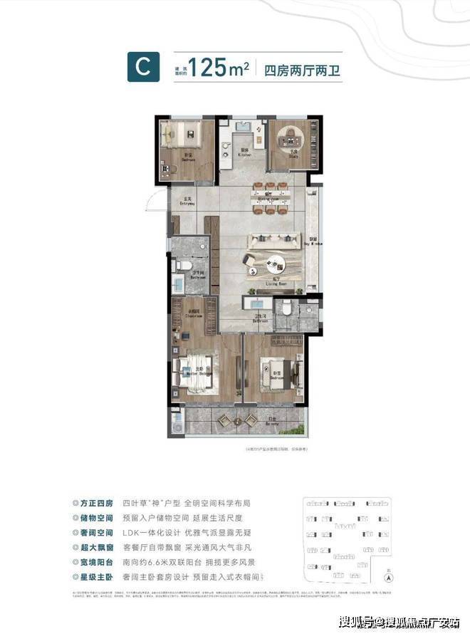 在空间的设计上,阅尚境均以阔绰的尺度考量,为新一代改善家庭量身定制从容悠享的非凡空间。125㎡“四叶草”全能四房为四房两厅两卫边套设计,客餐厅一体配备了大面宽、大视野飘窗;南向双卧室,设置了一体双阳台;入户同样带有隐藏式储物柜,预留客餐厅长柜空间,客卫干湿分离。
