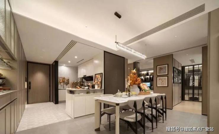 此外,室内还大量运用 雅士白大理石 、 大花白岩板 、 皇家孔雀岩板 、 水纹夹丝玻璃 、 仿洞石岩板 、 卡拉卡塔白岩板 、 灰色皮革 等定制材质,以 华润置地独有的“五奢体系” , 彰显着对高品质生活的极致追求