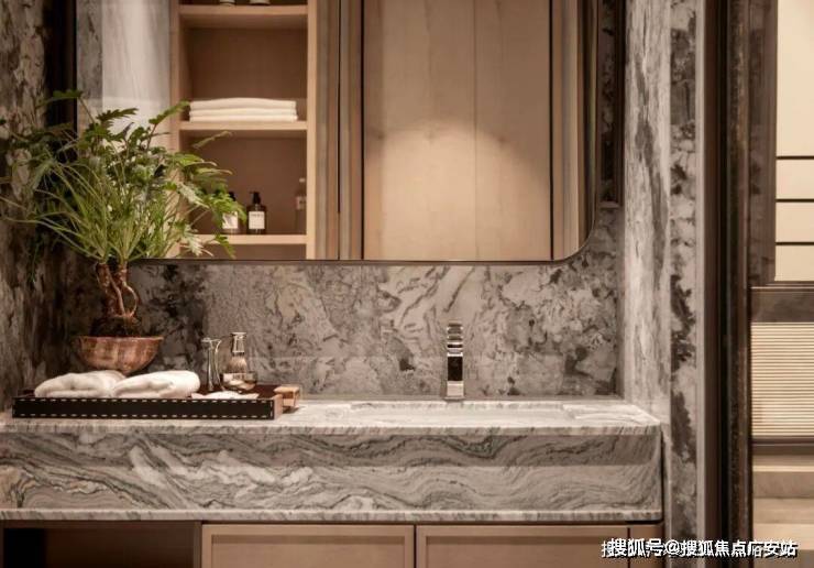 更耐用的细节:比如在主卧背景墙上使用了 胡桃木和带有贝母光泽的装饰,在淋浴房用了 水云纱石材,这些细节都在默默提升着日常生活的质感。