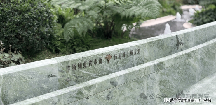 这归家的第一步不仅有了仪式感,宛若隐奢庄园的入口贵气自显!继续前行,一座玉石桥横跨水景之上。桥面满铺冷翡翠——这种顶级奢石据说已停止开采,在寻常豪宅中只舍得用作吧台或把手点缀。而在这里,上百位师傅以弧形手工打磨工艺,将整座桥变成一件不可复刻的艺术品。阳光洒下,石纹如冰川凝固、似绿丝带流淌。