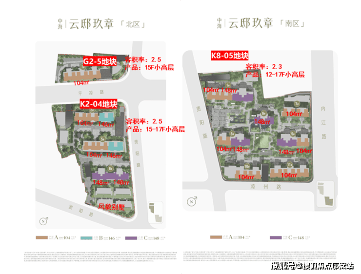 中海·云邸玖章分为南北两区、三个地块。