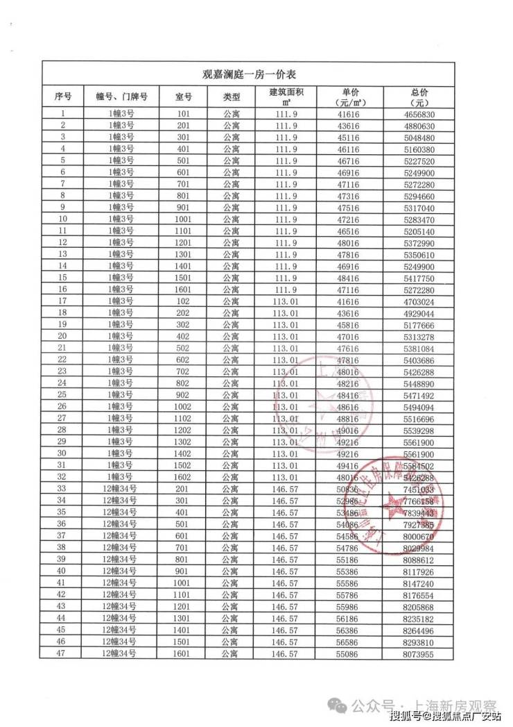 上期一房一价表如下: