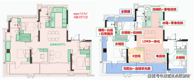 建面约123㎡户型,赠送面积足足17㎡,实得率大概92%,如果算上一梯一户的电梯厅,实得面积更是趋近100%!