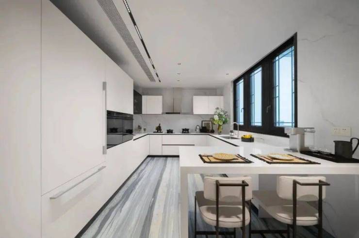 它的入口是定制游艇甲板级入户门,客厅大面积铺装意大利蓝金沙大理石,室内也全是ARMANI/Dada、意大利Poliform等一线大牌。