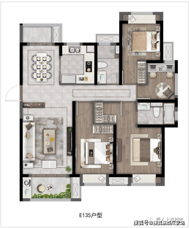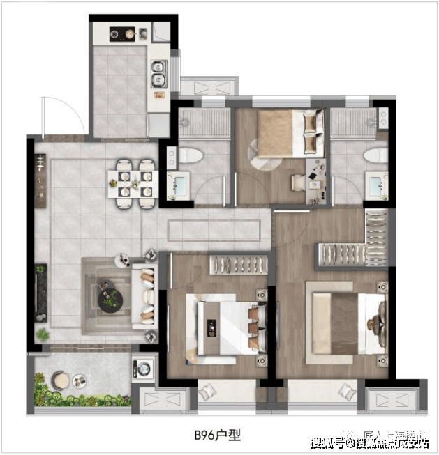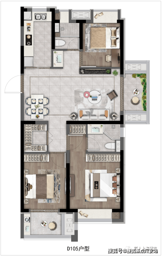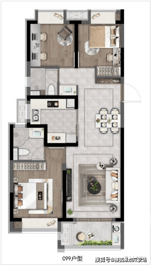 【梯数】两梯四户,东边套105平,西边套99平,中间套96平