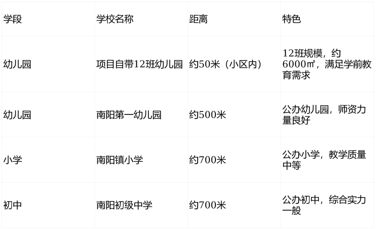 🏫教育资源一般:周边教育资源以南阳镇小学、南阳初级中学为主,缺乏顶尖名校,对重视子女教育的家庭吸引力有限