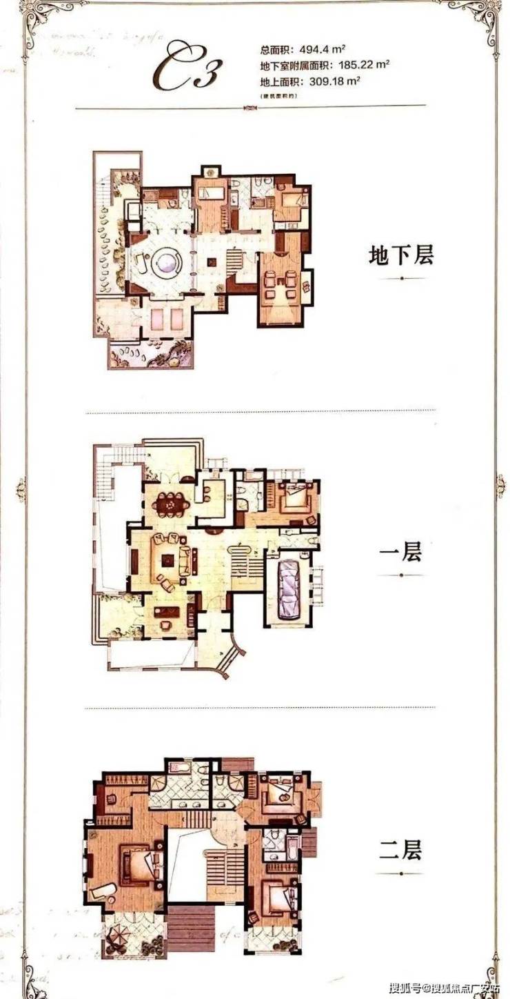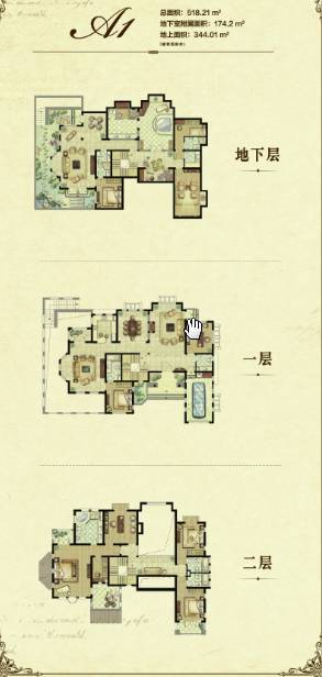 A1 地上388㎡(赠送)下沉庭院220㎡花园677㎡B1 地上326㎡(赠送)下沉庭院176㎡花园320㎡B2 地上342㎡(赠送)下沉庭院196㎡花园440㎡C1 地上309㎡(赠送)下沉庭院185㎡花园380㎡C2 地上266㎡(赠送)下沉庭院170㎡花园410,C3 地上309㎡(赠送)下沉庭院185㎡花园500㎡楼层数:地上2层,地下1层