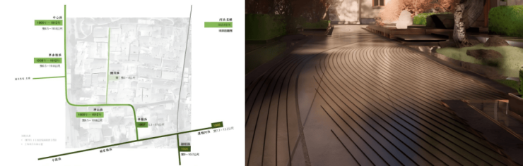 在亭桥街入口,项目铺设水纹地铺,用天然奢石拼贴出抽象水纹,还原了历史上河道交汇的意象;蓬莱路沿街则打造契合原生肌理的城市更新界面,让社区与周边风貌自然融合。