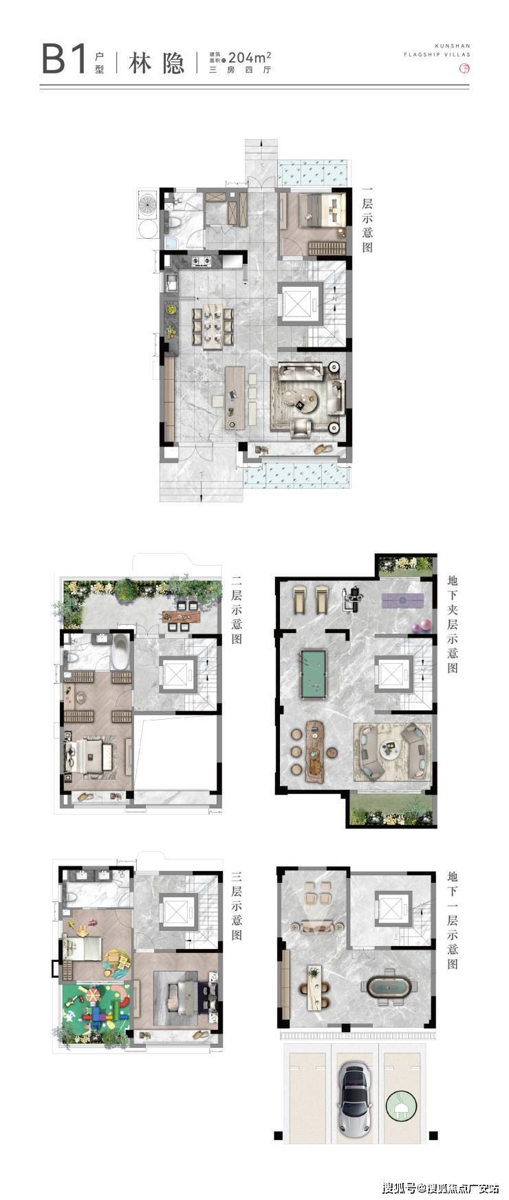联排别墅:203㎡(地上3F,地下2F),楼栋布于1-13#