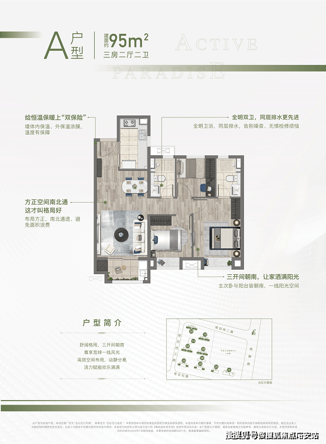 1、约95㎡的三房,南北通透,全明设计,三开间朝南,户型方正。