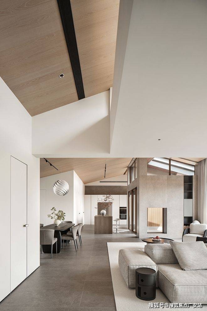 两面式沙发,打造出更随意的坐卧选择与舒适体验。木质吊顶铺展延伸,层次错落有致,仿若将室外的自然意境延伸到了屋内,简雅质朴而温润有加。