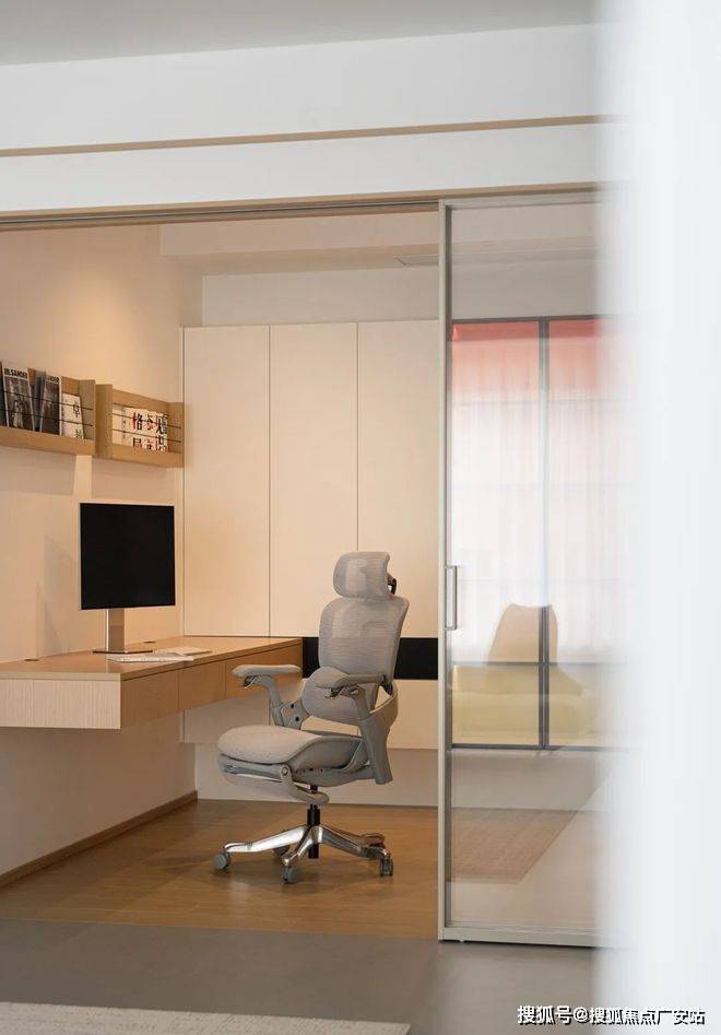 一间卧室被改造成了书房,拆除了与客厅之间的墙体,采用玻璃移门进行隔断,形成了一个可开合的书房空间,既保持了通透感,又增加了功能性。