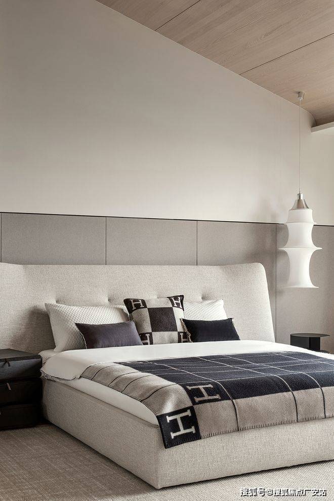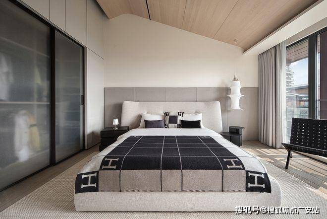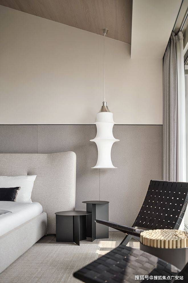 卧的斜形顶与整体空间相呼应,以质感深色作为主色调,营造出沉稳内敛的休憩氛围。
