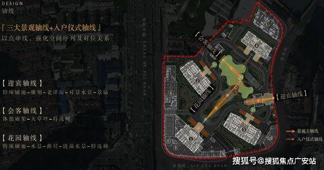三大景观轴线分别是:迎宾轴线、会客轴线、花园轴线。