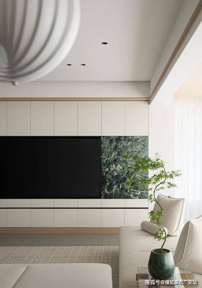 下方设计师特意开出一个低窗,与露台取得了巧妙的联动,呼吸感十足,让人在客厅之中,可以抬眼望向窗外景观,将生活的张与驰拿捏得恰到好处。