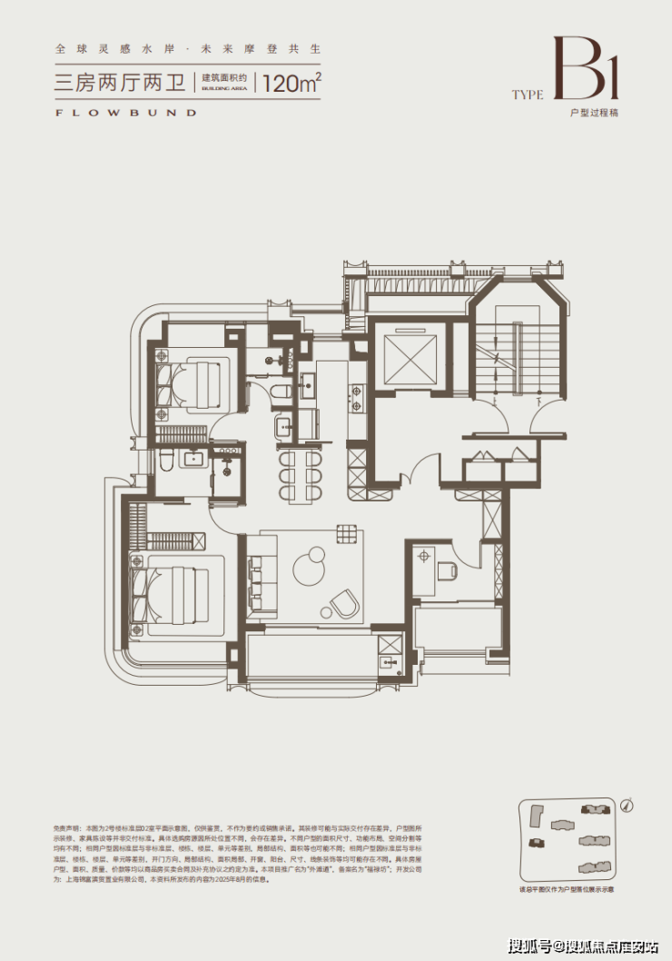 建面约120㎡3房2卫户型