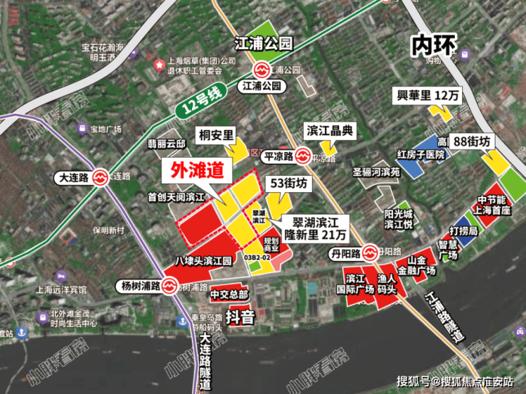 今年6月的土拍中,杨浦“单价地王”64街坊新地块锚定15万+!从地理位置上,它距离滨江约有1.2km,且离中心更远。