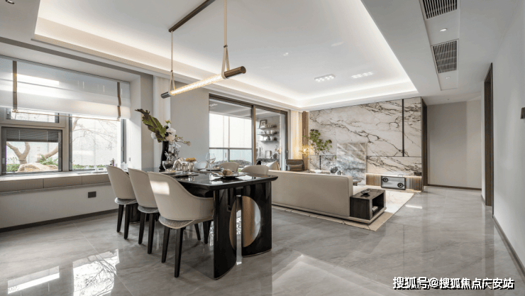 立面通过简洁的横向构图,大面积玻璃运用,呈现通透的光感效果,强调室内室外空间的融合、让建筑与景观互相呼应。局部金属线条装饰点缀,在光影的折射下,呈现出时间淬炼的美妙观感,映见轻盈雅致的艺术品位。