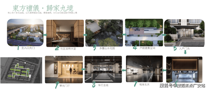 九重归家动线:社区入口双层酒店式形象门楼——(地上归家)社区会所大堂、多重山水花园、楼前雅集空间、单元大堂 ——(地下归家)地库出入口、地库玄关、车行主线、地下层单元大堂