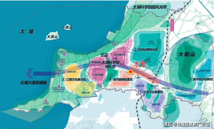 本案位于太湖大道发展主轴上,占位城市服务配套区,串联新区行政中心、文体中心、时尚水岸商业街、科技城医院、南大、太湖等现有资源。