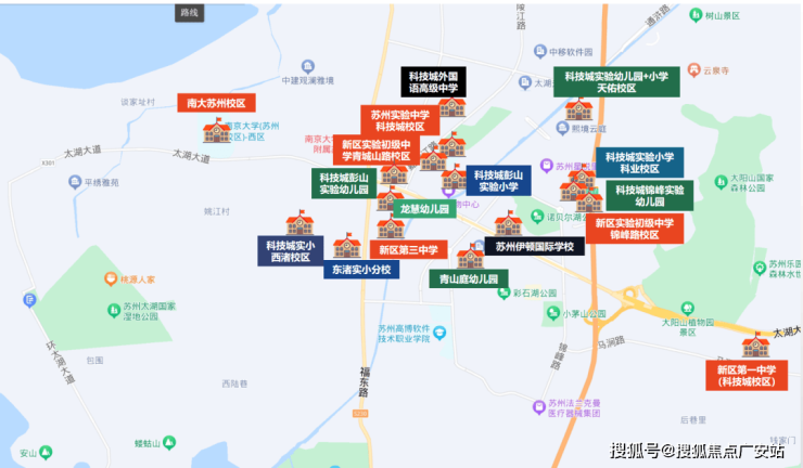 苏州科技城西渚实验幼儿园,苏州科技城实验小学,苏州实验初级中学,高新区第三中学,科技城外国语,南京大学等