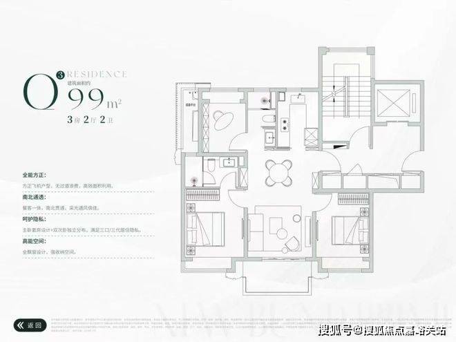 11#、15#、17#总高14F,户型为建面约99㎡3房2厅2卫,仅17#东边户为建面约86ni3房2厅1卫,一梯两户,层高3.05米;