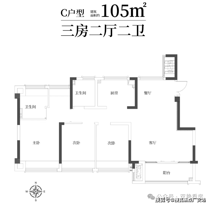04建筑面积约105㎡宽厅三房两卫,四开间朝南,舒适栖居理想