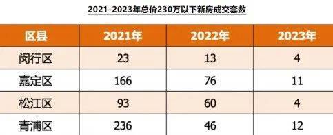 以上海西面四大区为例,数据显示,总价230万以下新房入市套数逐年缩减严重,2023年至今四个区加起来也只有约31套!