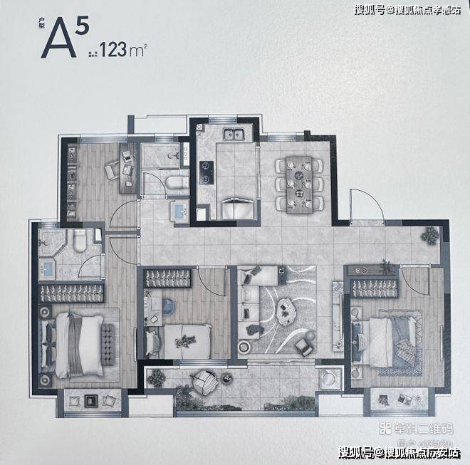 建面约123㎡的4房2厅2卫户型,超大面宽南向阳台、整体南北通透、主卧套房的设计,提升居住空间。