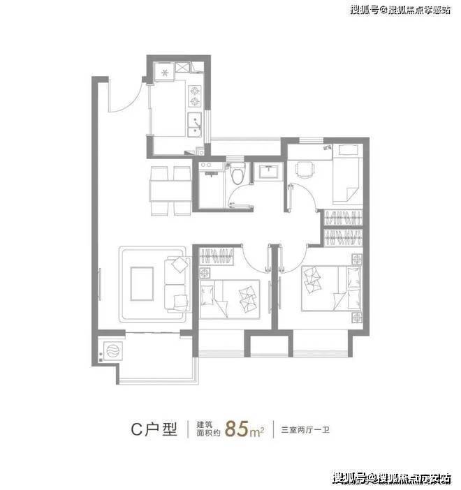 建面约85㎡的3房2厅1卫,三开间朝南+整体动静分离的设计,都保证了这个户型的居住舒适度。整个户型全明设计,户型方正,南北通透,卫生间干湿分离,光明对于产品细节的把控力可见一斑。