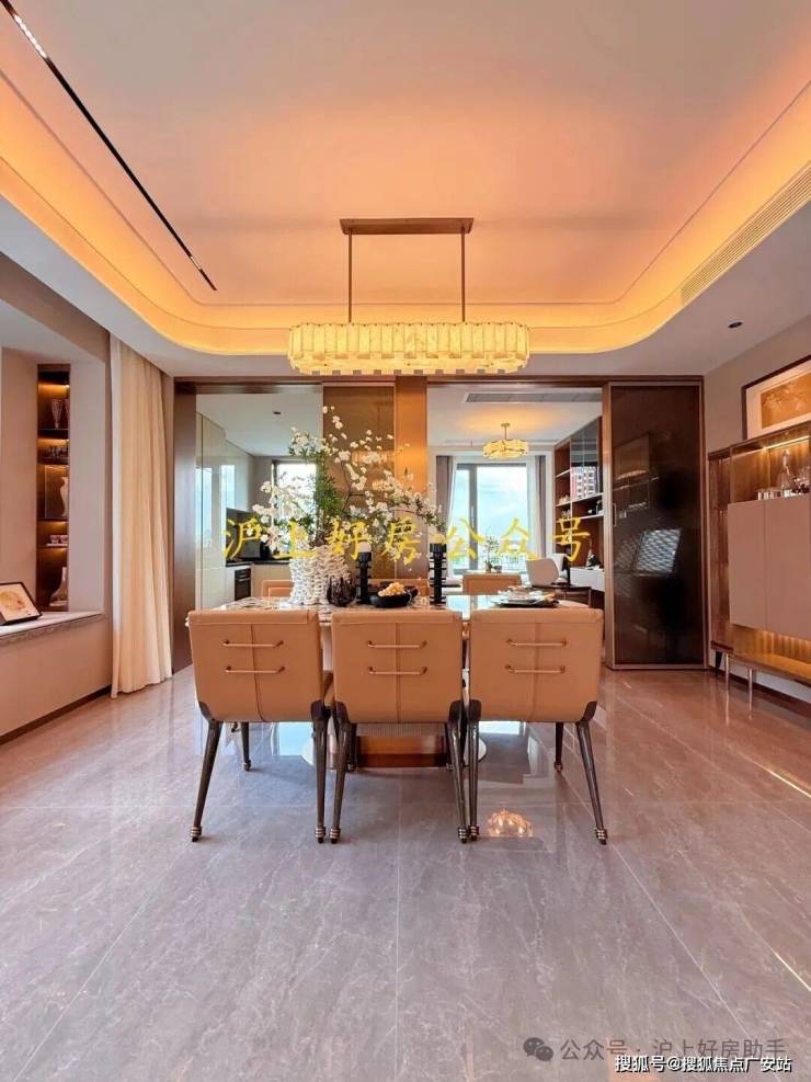 建筑面积约165㎡户型样板间,打造南向4.5开间,即在4开间的基础上,通过设计手法将餐厅、客厅、厨房、阳台融为一体,让传统竖厅的通透格局同时具备横厅的宽广空间。