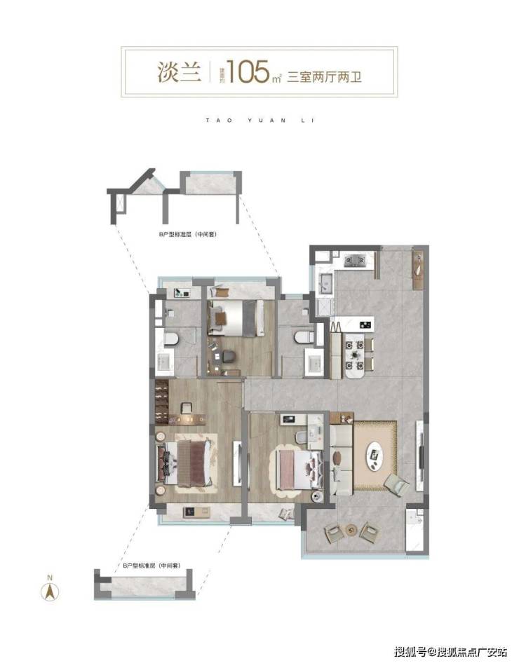 建筑面积约105㎡户型样板间,得房率达到约78%,相对传统“2+1房”设计,可以做到正三房,即每个房间可以摆下大床与衣柜,为每位家庭成员提供完整居住功能。