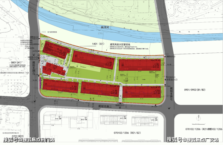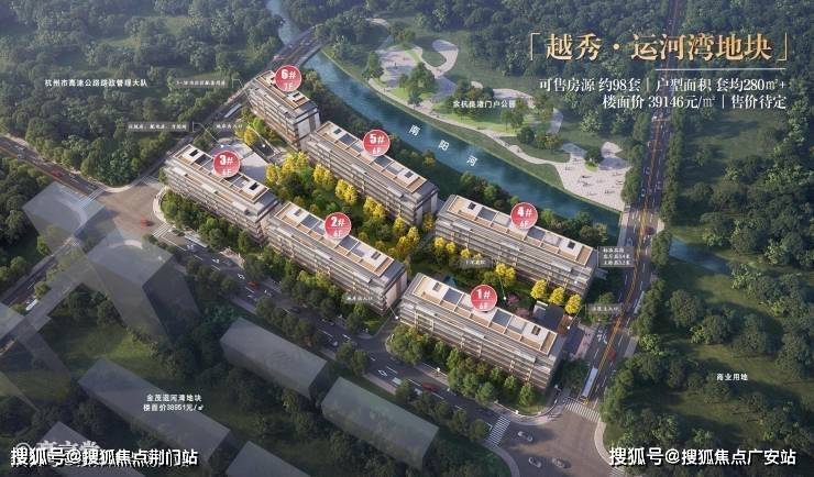 项目北面河景,再往远处是上塘高架,直线约150米左右;东面商地,小区主要出入口就在这个方向;西、南两面有次要出入口;