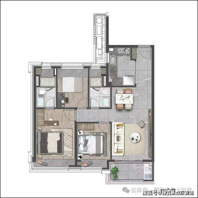 该户型贴合当代人居生活习惯,既适合三口之家小太阳家庭,也可以是三代同堂,每个人都能拥有独立空间。