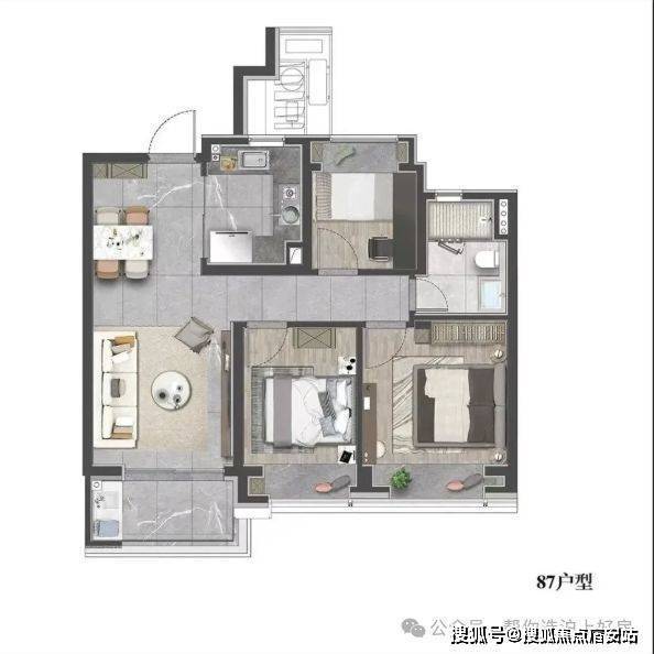 建面约87㎡3房,做到了三开间朝南设计,整个户型几乎没有浪费面积。实现空间节约、居住升级等美好体验。