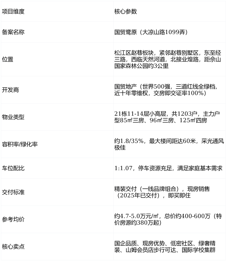 核心结论速览:这是大虹桥西赵巷板块由国企国贸地产打造的1.8容积率低密小高层社区,包含精装小高层(85-125㎡),优势集中在国企品质保障(三道红线全绿档)、现房即买即住(2025年交付)、低密规划(最大楼间距60米)、绿奢精装标准、山姆会员店步行7分钟、国际学校集群;短板是距9号线佘山站约2.5-3公里需接驳、总价门槛较高(约400-600万)、部分楼栋临主干道有噪音、周边配套成熟度一般。适合预算400万+追求生态低密居住、看重教育资源与国企品质、依赖自驾通勤的刚需/刚改家庭。