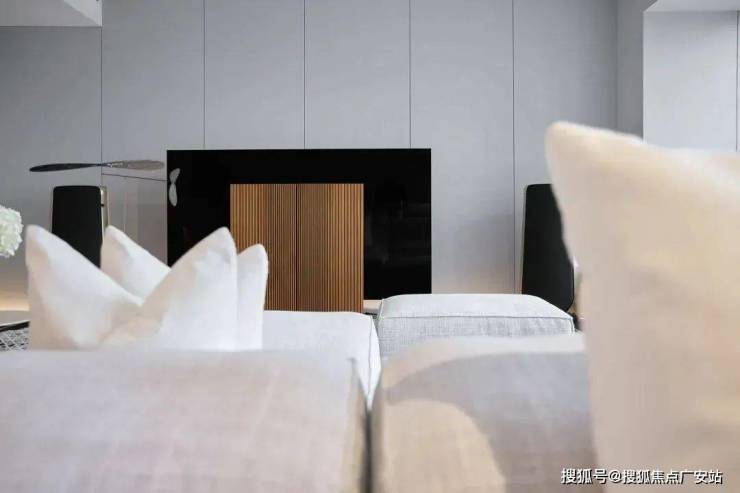 岛台旁做了壁炉的设计,壁炉上方嵌入一组隐形收纳柜,无门把的推弹设计,与墙体齐平,保证了立面整洁连贯的视觉观感。