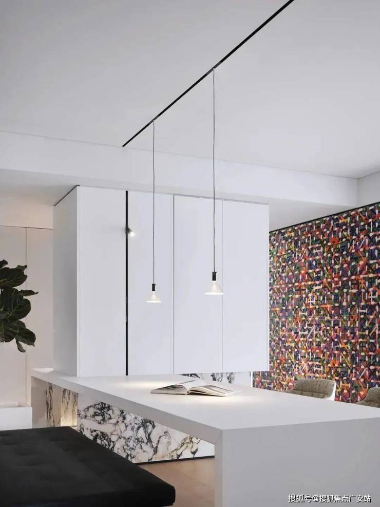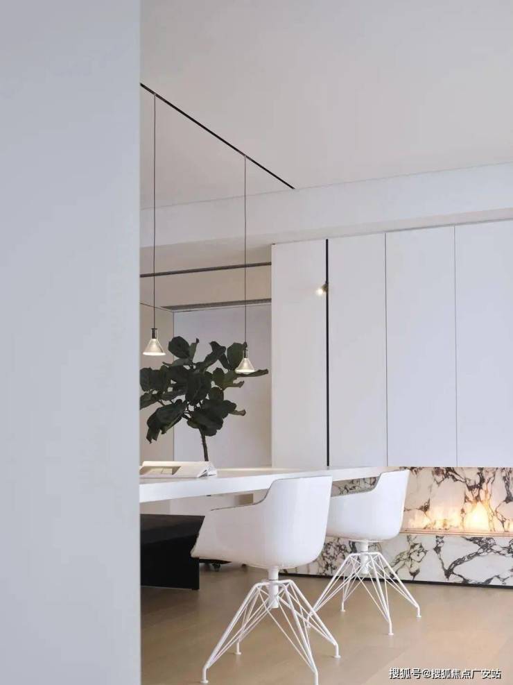 穿过玄关,极简的白,岛台、台面、吊柜均处理为细腻的白色面板贯穿,极致的纯粹其实很美。中岛的空间,既是用餐区,也是家人平时学习工作的区域。