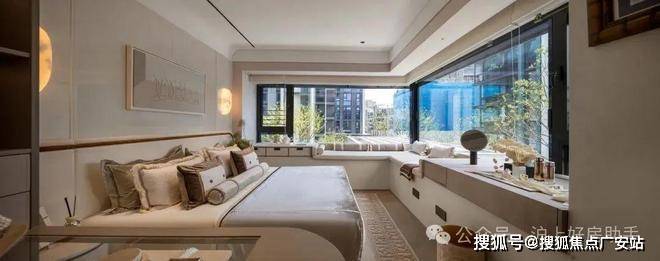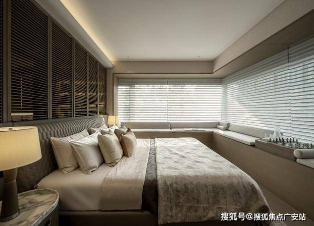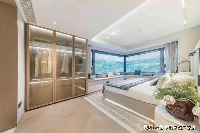 主卧拥有270度环幕飘窗,视野和采光优越,配备了高奢卫生间,空间感、尊崇感拉到顶格。