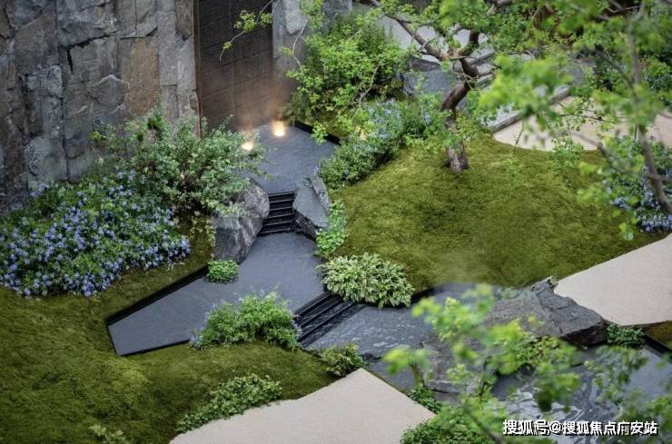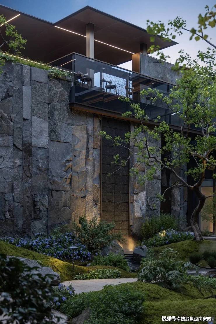 里面点缀着特选黑松、羽毛枫、4棵乌桕等,以及采用约40吨自然石皮面打造的垂直立面墙,整个庭院犹如立体山水画卷,每一个角度都有不一样的风景。