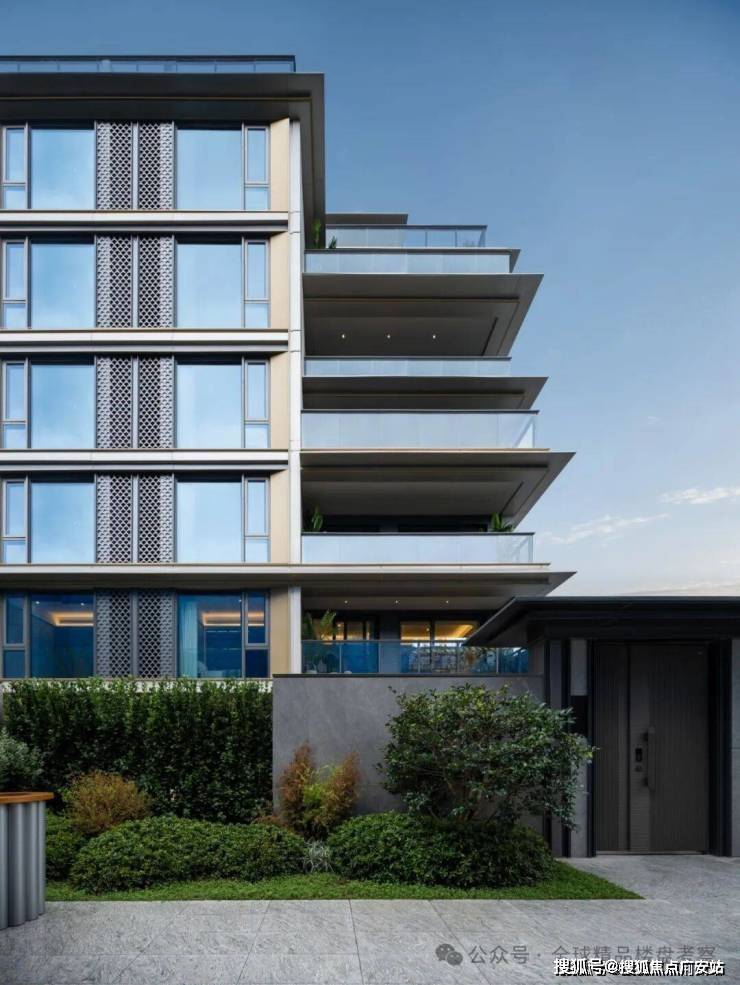 叠墅的顶冠采用披檐形态,铝板立面+香槟金的线条勾勒,呈现「现代极简」的视觉感受。