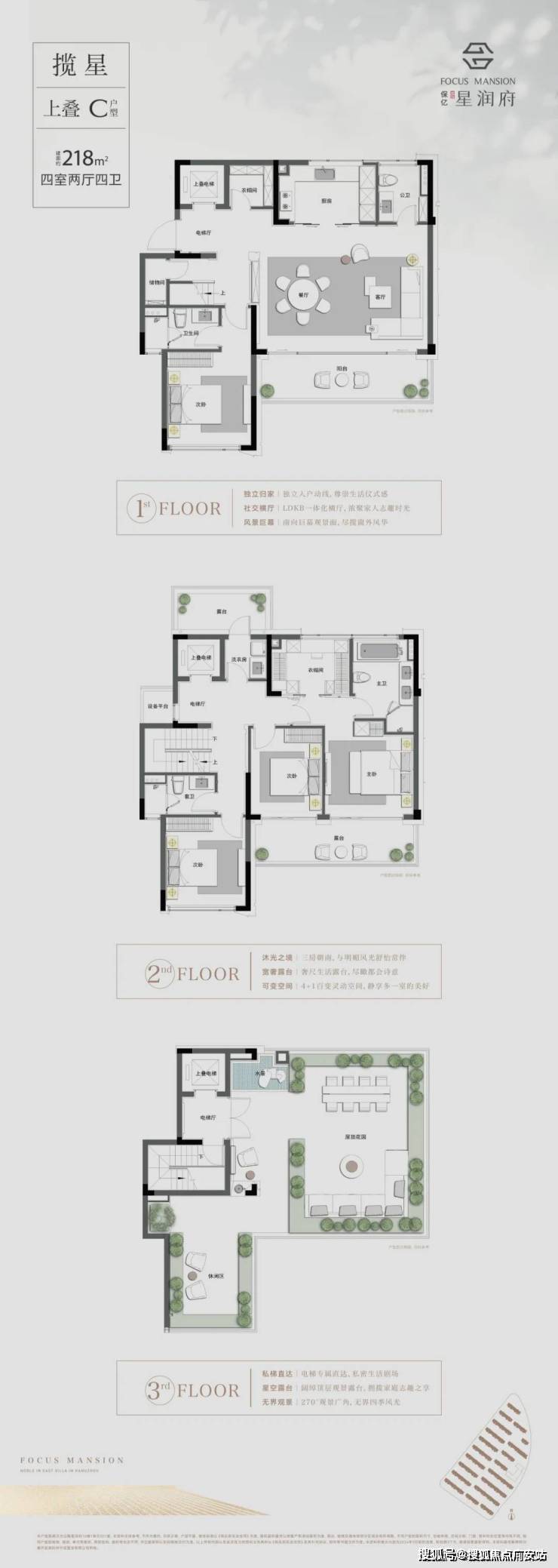 上叠 C 户型建筑面积约 218 方,其最大的亮点是拥享超尺观景露台。站在露台上,可以将周边的美景尽收眼底,无论是日出的壮丽还是日落的余晖,都能成为生活中的一道美丽风景。上叠的室内布局也十分合理,客厅挑高设计,增加了空间的层次感和开阔感。卧室宽敞明亮,通风良好,为居住者提供了舒适的睡眠环境。