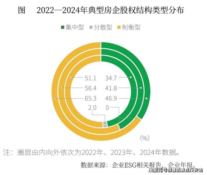 在股权结构方面,房企股权结构优化,制衡性股权结构占比持续提升。根据对49家典型房企股权结构统计,第一大股东控股比例在50%以上的集中型股权结构房企有17家,占比约34.7%,较上年下降约7.1个百分点;第一大股东控股比例介于10%~50%的制衡型股权结构房企有32家,占比约65.3%,较上年提升约8.9个百分点。