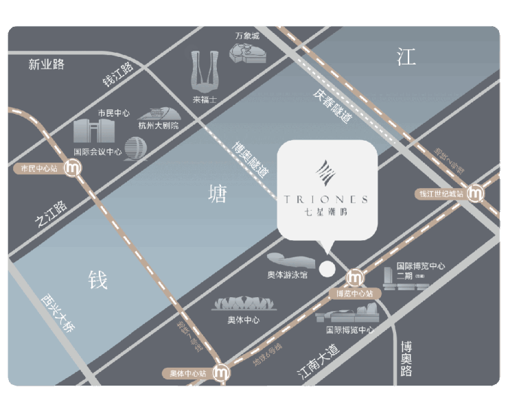 七星潮鸣享有TOD上盖交通优势,地铁6号线博览中心站上盖,30分钟直达火车东站、萧山机场。项目周边形成“三隧双轨”路网,博奥隧道、庆春隧道、望江隧道10分钟直抵钱江新城。