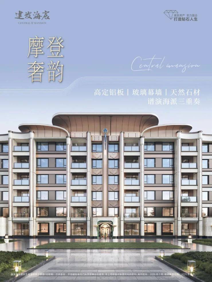 建发「宸系」中式作品,铝板与玻璃幕墙外立面,配园林景观。约1150套房源高低配,限高40米,含小高层、洋房、叠墅产品,满足刚需与改善需求。