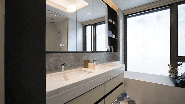 精装交付标准:配备大金中央空调、威能地暖、嘉格纳厨电、杜拉维特卫浴等国际一线品牌,细节极致,如玄关预留扫地机器人基站、卫生间镜柜内嵌USB接口