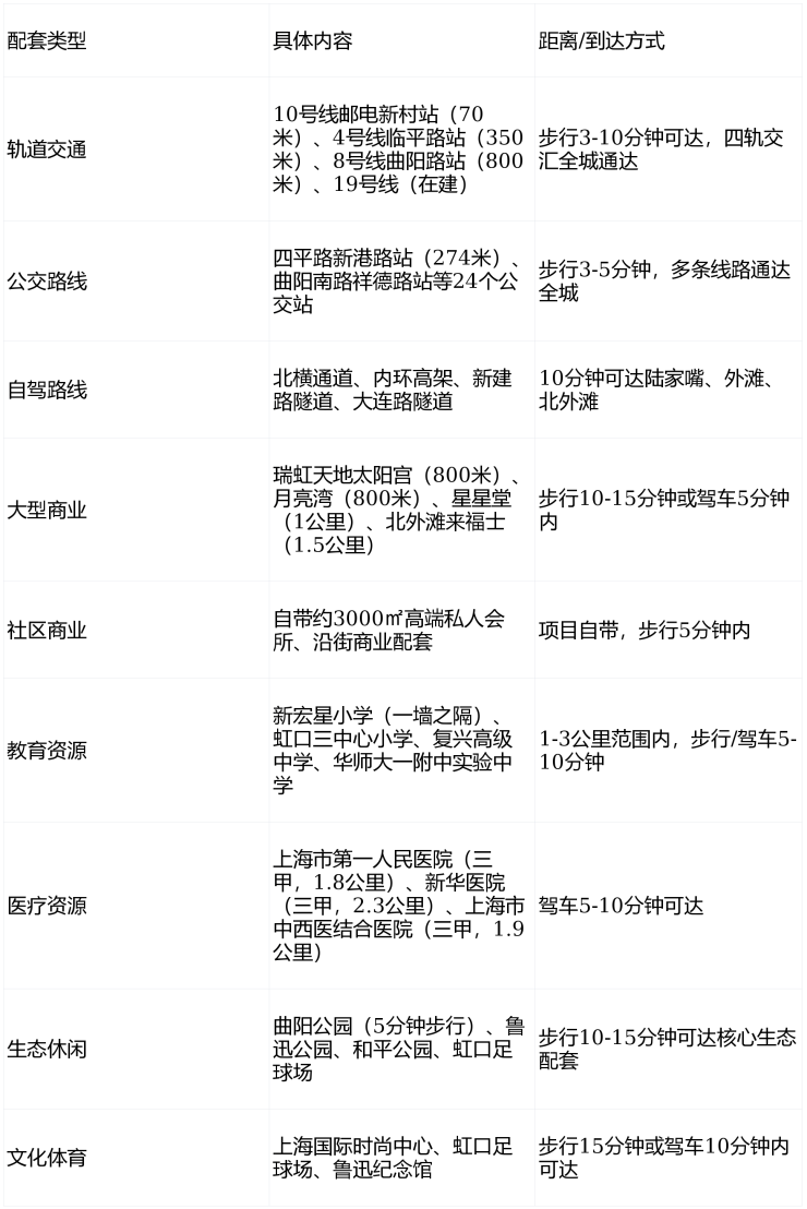 交通方面:项目距轨道交通10号线邮电新村站仅400米,周边还有多条公交线路,自驾上,可通过四平路、曲阳南路、天虹路、临平北路,虹关路、新港路、宝山路、北横通道等道路通达全城。