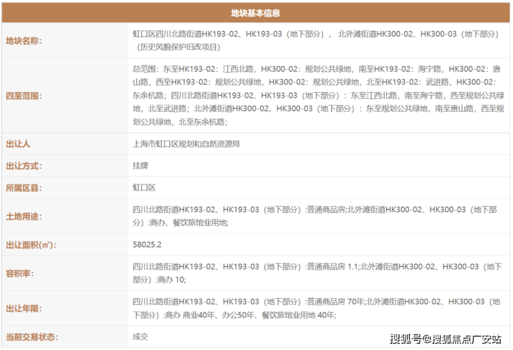 2021年2月,上海虹口城市更新建设发展有限公司(上海地产联合体)以111.35亿拿下了虹口区四川北路街道HK193-02(17街坊弘安里)、HK193-03(地下部分);北外滩街道HK300-02、HK300-03(地下部分)(历史风貌保护旧改项目)。