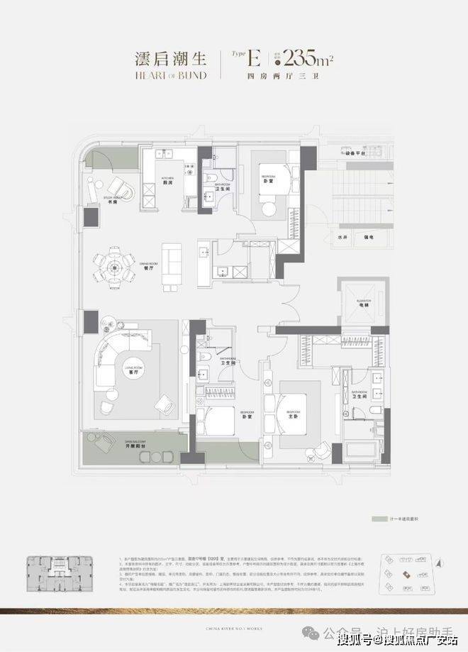 本次推出的235㎡户型是中心楼王的西边套。这个户型既有江景、又被社区中心景观环绕;既远离道路规避噪音、又直面下沉会所享受便利;而且还是全景舱全边套端厅看江户型。